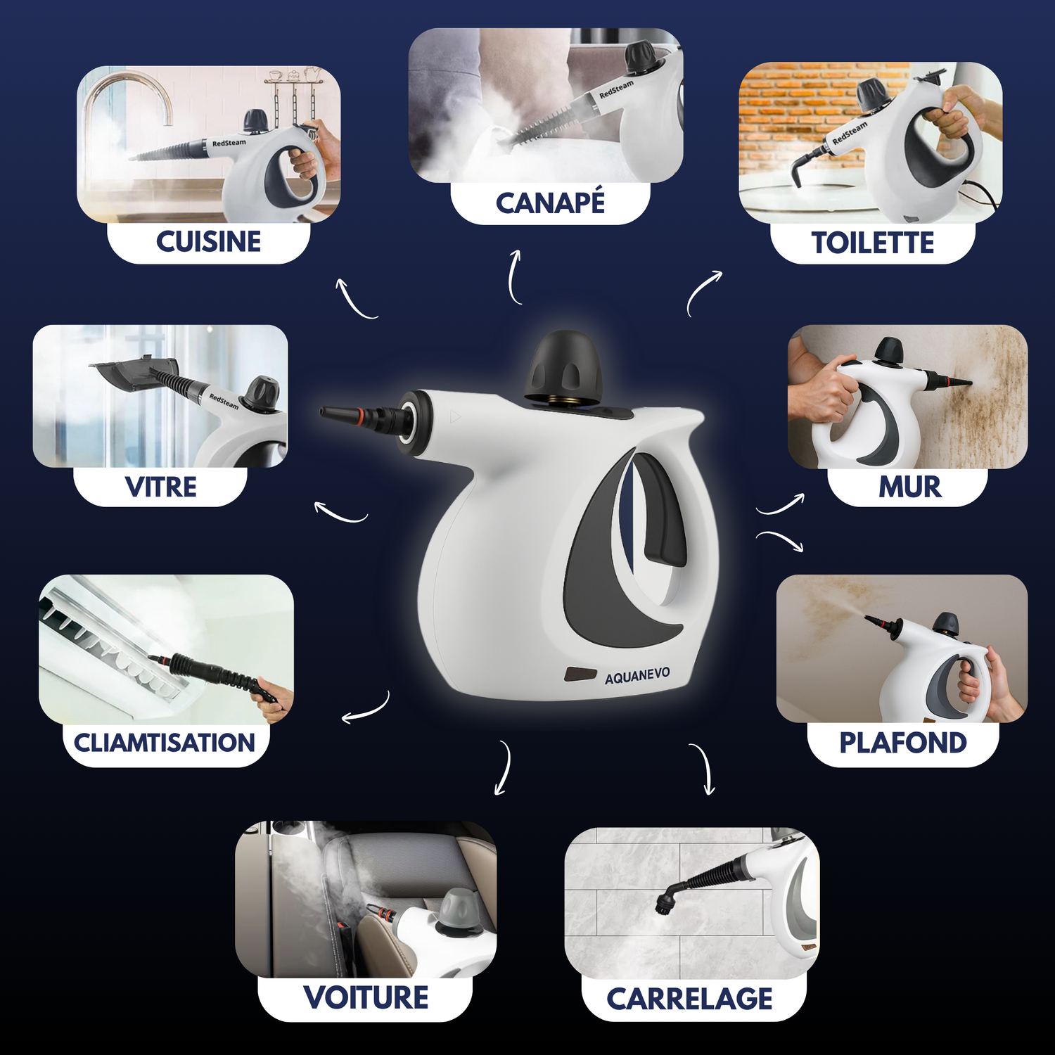 Nettoyez votre maison de fond en comble, sans produit chimique. Aquanevo s’occupe de tout, sur toutes les surfaces.